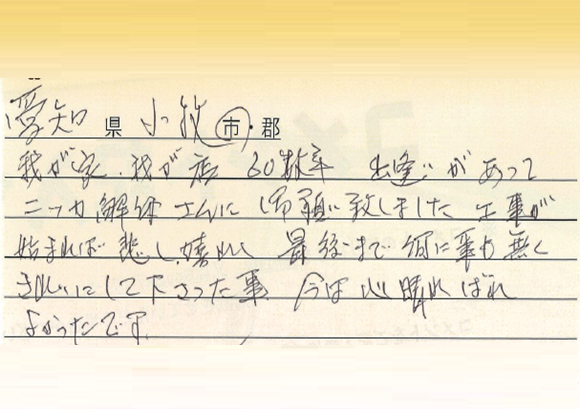 我々の思い 採用情報 不用品処理サービス 解体後のサポート 電話受付:9:00~18:00 (月曜日~金曜日) 0120-00-8655 解体費用シュミュレーション お問い合わせ 解体ニッカの強み 解体実績 価格表 解体工事の流れ 解体費用シミュレーション お客様の声 よくあるご質問 我々の思い 不用品処理サービス 解体後のサポート 産業廃棄物の処理 リフォーム工事とサービス スタッフ紹介 会社案内 採用情報 0120-00-8655営業時間/9:00~18:00 定休日/土日祝 お問い合わせ 解体費用シュミュレーション HOME 〉お客様の声 愛知県 T様 豊明市 I様 名古屋市 K様 東郷町 K様 名古屋市 M様 名古屋市 S様 名古屋市 T様 名古屋市 I様 小牧市 N様 1 2 3 4 次へ